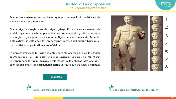 Existen determinadas proporciones, que por su equilibrio satisfacen de manera natural la percepción. Canon, significa regla y es de origen griego. El canon es un modelo de medidas que se consideran perfectas que son aceptadas y utilizadas como una regla o guía para representar la figura humana. Mediante fórmulas matemáticas se establece las proporciones ideales del cuerpo humano; el cual se divide en partes llamadas módulos. La primera vez en la historia que este concepto apareció fue en la escuela de Atenas con Policleto (escultor griego) quien estableció en el “Doríforo” un canon para la figura humana perfecta de siete cabezas. Más adelante, este canon cambió con Lisipo, quien alargó la figura humana hasta 8 cabezas.