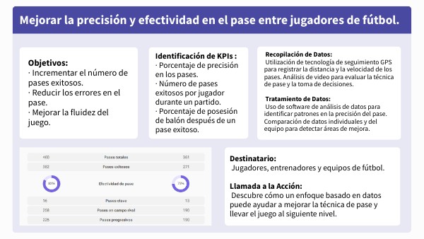 Destinatario: Jugadores, entrenadores y equipos de fútbol. Llamada a la Acción: Descubre cómo un enfoque basado en datos puede ayudar a mejorar la técnica de pase y llevar el juego al siguiente nivel.