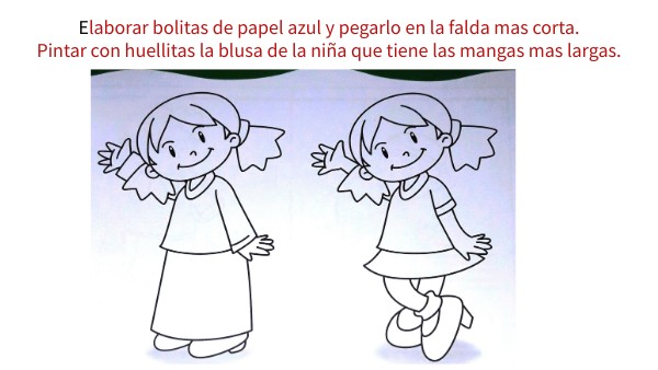 Elaborar bolitas de papel azul y pegarlo en la falda mas corta. Pintar con huellitas la blusa de la niña que tiene las mangas mas largas.