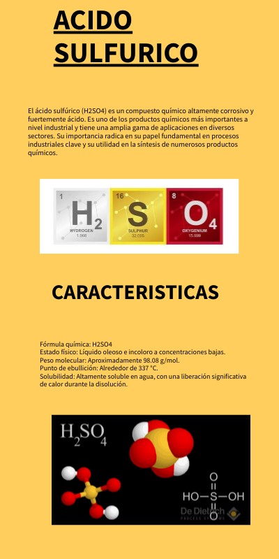 Fórmula química: H2SO4 Estado físico: Líquido oleoso e incoloro a concentraciones bajas. Peso molecular: Aproximadamente 98.08 g/mol. Punto de ebullición: Alrededor de 337 °C. Solubilidad: Altamente soluble en agua, con una liberación significativa de calor durante la disolución.