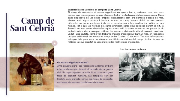 Experiència de la Remei al camp de Sant CebriàEl camp de concentració estava organitzat en quatre barris, cadascun amb els seus carrers que convergeixen en una plaça central on es trobaven els barracons-cuina. Cada barri disposava de les seves pròpies instal·lacions com ara bombes d'aigua de mar, aixetes amb aigua potable i lavabos. A més, el camp estava dividit en tres sectors diferents: un per a les dones i els nens, un altre per a les famílies i un últim per als homes. Tot i que les normes del camp prohibien sortir dels barracos durant la nit, la Remei i en Joan sovint desobeïen aquesta restricció i sortien en secret per passar la nit amb els veïns. Van aconseguir millorar les seves condicions de vida al barracó, construint un llit i una tauleta. També van trobar la manera d'aconseguir llum. A més, en Joan rebia un àpat addicional per netejar el camp de les 7 a les 10 del matí. Tot això reflecteix els esforços dels presoners per afrontar les difícils condicions del camp i trobar formes de millorar la seva qualitat de vida malgrat les restriccions imposades.