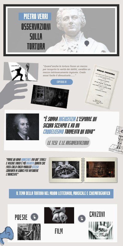 Pietro Verri è stato un importante filosofo, economista e politico italiano del XVIII secolo. Nato nel 1728 a Milano, è noto soprattutto per essere stato uno dei principali esponenti dell'Illuminismo in Italia e per il suo contributo alla formazione dell'economia politica moderna. Autore dell’opera "Osservazioni sulla tortura," fu scritto da Pietro Verri nel 1804. Pietro Verri era un economista, scrittore e politico italiano del XVIII secolo. Il trattato rappresenta una critica alla pratica della tortura e riflette le idee illuministe dell'epoca riguardanti i diritti umani e il trattamento umano. Verri sosteneva che la tortura non solo fosse immorale, ma fosse anche inutile come strumento per ottenere informazioni attendib Verri è anche autore di un trattato intitolato "Elementi di economia civile" (1767), dove analizza temi economici e sociali del suo tempo. In merito alla tortura, anche in questa opera,Verri si oppose fermamente alla pratica, sostenendo che fosse non solo moralmente riprovevole ma anche inefficace nella ricerca della verità. La sua posizione in merito alla tortura rifletteva il suo impegno per una maggiore giustizia e umanità nel sistema legale. La sua opera ha avuto un impatto significativo sul pensiero politico ed economico dell'epoca ed è ancora studiata e apprezzata oggi.