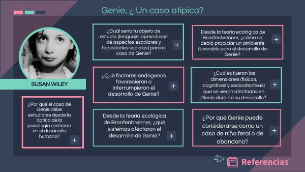 Berger, K. (2012). Psicología del Desarrollo. Infancia y adolescencia. (9a Edición). Editorial Médica Panamericana.https://www-medicapanamericana-com.pbidi.unam.mx:2443/VisorEbookV2/Ebook/9788498359824?mode=demo#{%22Pagina%22:%22Portada%22,%22Vista%22:%22Indice%22,%22Busqueda%22:%22%22} Clikerman, M., & Teeter, E. (2011). Neuropsicología Infantil. Evaluación e Intervención en los trastornos neuroevolutivos. (Segunda Edición). Pearson Educación. https://bookshelf-ref.vitalsource.com/books/9788415552000 Dombrowski, S., Gischlar, K., & Mrazik, M. (2011). Feral Children. En Assesing and Treating LowIncidence/High Severity Psichological Disorders of Childhood (pp. 81-92). Springer. file:///C:/Users/lenovo/Downloads/978-1-4419-9970-2.pdf García, L. (2020). Principales Teorías del Desarrollo. Universidad de San Marcos. Gifre, M., & Esteban, M. (2012). Consideraciones Educativas de la Perspectiva Ecológica de Urie Bronfenbrenner. Contextos Educativos., 15, 79-92. Pérez, N., & Navarro, I. (2011). Psicología del Desarrollo Humano: Del nacimiento a la Vejez. Editorial Club Universitario. http://biblioteca.univalle.edu.ni/files/original/428d26dbe6b7e6835eaa900697b62144c78282da.pdfPsiqueacadémica (Director). (2021). Teoría Ecológica de Bronfennbrenner. Psiqueacadémica.