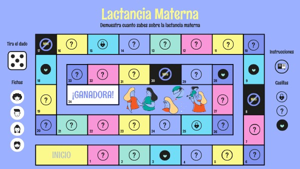 Eligan personajes y empezará la persona que ya haya lactado, en el caso de ser más de una se tiran los dados entre ellas para saber quien empieza. En el caso de que nadie haya lactado los turnos seran de acuerdo a la edad empezando el jugador más joven. Se tirarán los dados y avanzaran el numero que muestre el dado, tendras que responder la pregunta de la casilla, si respondes correctamente avanzarás una casilla más, de lo contrario quedará en el mismo lugar. Gana el primer jugador en llegar al final. ¡Mucha suerte!