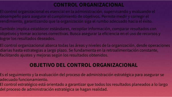 El control organizacional es esencial en la administración, supervisando y evaluando el desempeño para asegurar el cumplimiento de objetivos. Permite medir y corregir el rendimiento, garantizando que la organización siga el rumbo adecuado hacia el éxito.