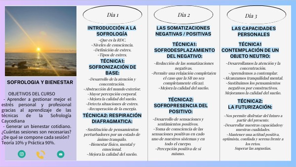 OBJETIVOS DEL CURSO - Aprender a gestionar mejor el estrés personal y profesional gracias al aprendizaje de las técnicas de la Sofrología Caycediana - Generar un bienestar cotidiano. ¿Cuántas sesiones son necesarias? ¿De qué se compone cada sesión? Teoría 10% y Práctica 90%.