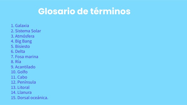 2. Sistema Solar3. Atmósfera 4. Big Bang 5. Bisiesto 6. Delta 7. Fosa marina 8. Ría 9. Acantilado 10. Golfo 11. Cabo 12. Península 13. Litoral 14. Llanura 15. Dorsal oceánica.