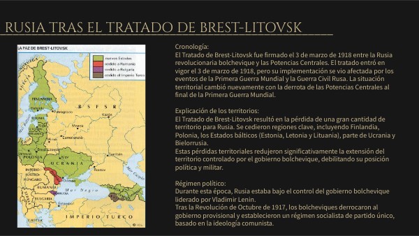 Cronología:El Tratado de Brest-Litovsk fue firmado el 3 de marzo de 1918 entre la Rusia revolucionaria bolchevique y las Potencias Centrales. El tratado entró en vigor el 3 de marzo de 1918, pero su implementación se vio afectada por los eventos de la Primera Guerra Mundial y la Guerra Civil Rusa. La situación territorial cambió nuevamente con la derrota de las Potencias Centrales al final de la Primera Guerra Mundial. Explicación de los territorios: El Tratado de Brest-Litovsk resultó en la pérdida de una gran cantidad de territorio para Rusia. Se cedieron regiones clave, incluyendo Finlandia, Polonia, los Estados bálticos (Estonia, Letonia y Lituania), parte de Ucrania y Bielorrusia.Estas pérdidas territoriales redujeron significativamente la extensión del territorio controlado por el gobierno bolchevique, debilitando su posición política y militar. Régimen político: Durante esta época, Rusia estaba bajo el control del gobierno bolchevique liderado por Vladimir Lenin.Tras la Revolución de Octubre de 1917, los bolcheviques derrocaron al gobierno provisional y establecieron un régimen socialista de partido único, basado en la ideología comunista.