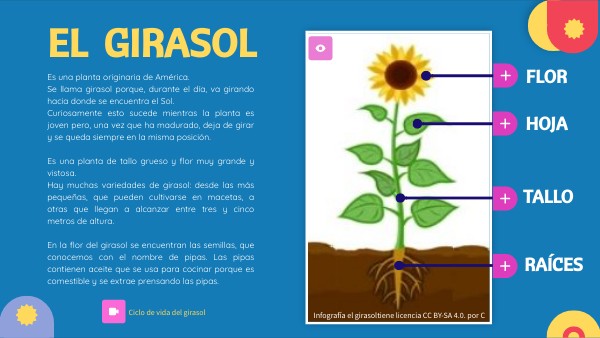 Es una planta originaria de América.Se llama girasol porque, durante el día, va girando hacia donde se encuentra el Sol. Curiosamente esto sucede mientras la planta es joven pero, una vez que ha madurado, deja de girar y se queda siempre en la misma posición. Es una planta de tallo grueso y flor muy grande y vistosa. Hay muchas variedades de girasol: desde las más pequeñas, que pueden cultivarse en macetas, a otras que llegan a alcanzar entre tres y cinco metros de altura. En la flor del girasol se encuentran las semillas, que conocemos con el nombre de pipas. Las pipas contienen aceite que se usa para cocinar porque es comestible y se extrae prensando las pipas.