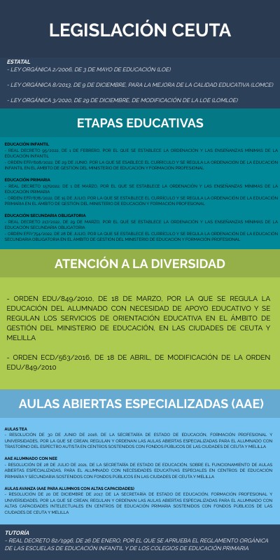 AULAS TEA- RESOLUCIÓN DE 30 DE JUNIO DE 2016, DE LA SECRETARÍA DE ESTADO DE EDUCACIÓN, FORMACIÓN PROFESIONAL Y UNIVERSIDADES, POR LA QUE SE CREAN, REGULAN Y ORDENAN LAS AULAS ABIERTAS ESPECIALIZADAS PARA EL ALUMNADO CON TRASTORNO DEL ESPECTRO AUTISTA EN CENTROS SOSTENIDOS CON FONDOS PÚBLICOS DE LAS CIUDADES DE CEUTA Y MELILLA AAE ALUMNADO CON NEE - RESOLUCIÓN DE 28 DE JULIO DE 2021, DE LA SECRETARÍA DE ESTADO DE EDUCACIÓN, SOBRE EL FUNCIONAMIENTO DE AULAS ABIERTAS ESPECIALIZADAS, PARA EL ALUMNADO CON NECESIDADES EDUCATIVAS ESPECIALES EN CENTROS DE EDUCACIÓN PRIMARIA Y SECUNDARIA SOSTENIDOS CON FONDOS PÚBLICOS EN LAS CIUDADES DE CEUTA Y MELILLA AULAS AVANZA (AAE PARA ALUMNOS CON ALTAS CAPACIDADES) - RESOLUCIÓN DE 20 DE DICIEMBRE DE 2017, DE LA SECRETARÍA DE ESTADO DE EDUCACIÓN, FORMACIÓN PROFESIONAL Y UNIVERSIDADES, POR LA QUE SE CREAN, REGULAN Y ORDENAN LAS AULAS ABIERTAS ESPECIALIZADAS PARA EL ALUMNADO CON ALTAS CAPACIDADES INTELECTUALES EN CENTROS DE EDUCACIÓN PRIMARIA SOSTENIDOS CON FONDOS PÚBLICOS DE LAS CIUDADES DE CEUTA Y MELILLA