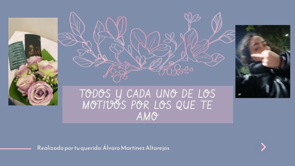 Te amo Elena, por haberme dado una oportunidad eres la persona más maravillosa que voy a conocer y quiero que sepas que siempre te voy a llevar en mi corazón porque me has cambiado la vida y no se cómo agradecértelo. Me siento la persona más afortunada del mundo ya que tú has aparecido en mi vida y gracias a tí se hace realidad la idea que tenía sobre el amor verdadero en la cabeza. Te voy a querer hasta que la muerte me separe de tu lado <3