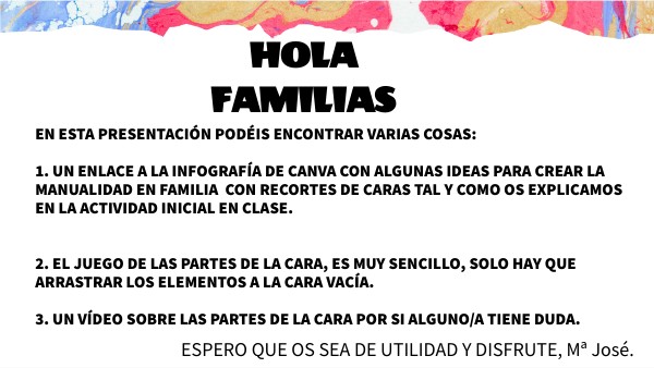 EN ESTA PRESENTACIÓN PODÉIS ENCONTRAR VARIAS COSAS: 1. UN ENLACE A LA INFOGRAFÍA DE CANVA CON ALGUNAS IDEAS PARA CREAR LA MANUALIDAD EN FAMILIA CON RECORTES DE CARAS TAL Y COMO OS EXPLICAMOS EN LA ACTIVIDAD INICIAL EN CLASE. 2. EL JUEGO DE LAS PARTES DE LA CARA, ES MUY SENCILLO, SOLO HAY QUE ARRASTRAR LOS ELEMENTOS A LA CARA VACÍA. 3. UN VÍDEO SOBRE LAS PARTES DE LA CARA POR SI ALGUNO/A TIENE DUDA.