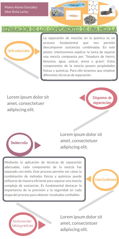 La separación de mezclas en la química es un proceso fundamental que nos permite descomponer sustancias combinadas. En este póster, intentaremos explicar la tarea de separar una mezcla compuesta por, “limadura de hierro, benceno, agua, azúcar, arena y grava”. Estos componentes de la mezcla poseen propiedades físicas y químicas. Para ello tenemos que emplear diferentes técnicas de separación.