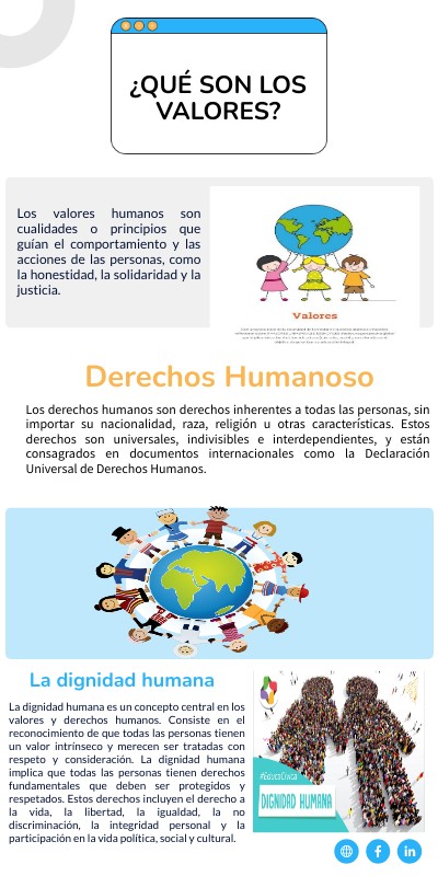 La dignidad humana es un concepto central en los valores y derechos humanos. Consiste en el reconocimiento de que todas las personas tienen un valor intrínseco y merecen ser tratadas con respeto y consideración. La dignidad humana implica que todas las personas tienen derechos fundamentales que deben ser protegidos y respetados. Estos derechos incluyen el derecho a la vida, la libertad, la igualdad, la no discriminación, la integridad personal y la participación en la vida política, social y cultural.