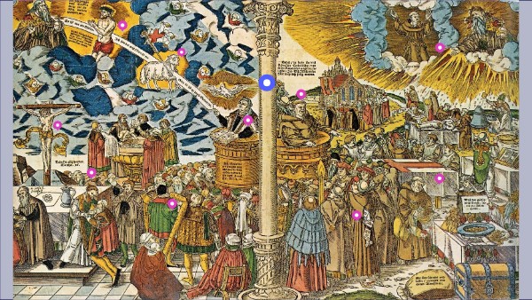 Esta obra se compone de dos partes opuestas, la izquierda representando al protestantismo “Iglesia Verdadera” y la derecha representando al Catolicismo “Iglesia Falsa”. Compara la iglesia protestante y la iglesia católica, solo representa a la iglesia protestante como la "iglesia verdadera" y a la iglesia católica como una iglesia corrupta y llena de pecado. Lucas Cranach es protestante porque representa un Dios enojado que castiga a los hombres y no hay relación directa con los fieles, Dios es accesible sólo a través de ciertas ceremonias en el catolicismo. Mientras que en el protestantismo representa un Dios tranquilo que bendice a sus fieles. Esta pintura es un signo de propaganda para representar el catolicismo como una "religión falsa" con el fin de desarrollar el protestantismo. Denuncia los sacramentos inútiles mostrando el catolicismo como una religión inspirada por el diablo y servida por un clero corrupto.