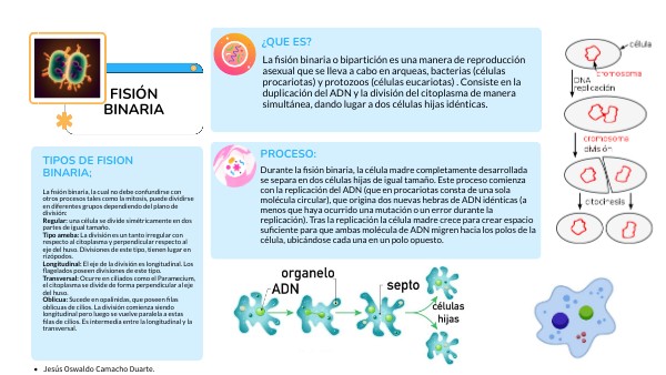 La fisión binaria o bipartición es una manera de reproducción asexual que se lleva a cabo en arqueas, bacterias (células procariotas) y protozoos (células eucariotas) . Consiste en la duplicación del ADN y la división del citoplasma de manera simultánea, dando lugar a dos células hijas idénticas.