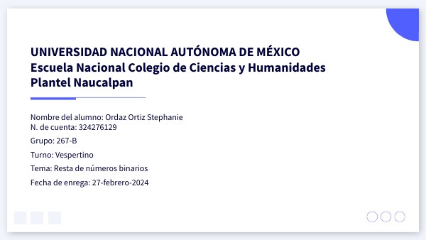 Nombre del alumno: Ordaz Ortiz StephanieN. de cuenta: 324276129 Grupo: 267-B Turno: Vespertino Tema: Resta de números binarios Fecha de enrega: 27-febrero-2024