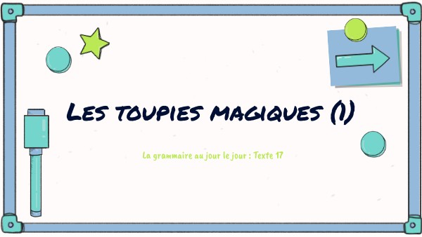 Les toupies magiques (1) Deux élèves ont expliqué à leurs camarades comment fabriquer trois toupies magiques. « Nous avons pris un bouchon de liège, trois allumettes et de la colle cellulosique. Nous avons découpé trois rondelles de 5 mm d’épaisseur dans le bouchon de liège et nous avons fait un trou au centre de chacune d’elles. Ensuite, nous avons taillé les trois allumettes en pointe. Nous avons découpé des disques colorés et nous avons percé le centre de chaque disque avec une épingle. Puis nous avons mis un peu de colle sur une rondelle de bouchon. Nous avons passé une allumette, pointe en bas, à travers un des disques découpés puis à travers la rondelle de bouchon encollée. Enfin, nous avons appuyé le disque contre le bouchon pour bien le coller. Nous avons construit chaque toupie de la même façon. »