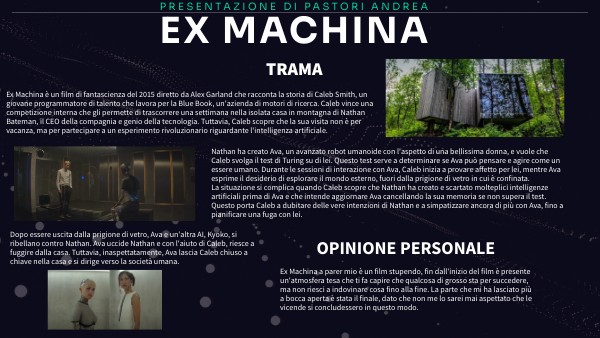 Ex Machina a parer mio è un film stupendo, fin dall'inizio del film è presente un'atmosfera tesa che ti fa capire che qualcosa di grosso sta per succedere, ma non riesci a indovinare cosa fino alla fine. La parte che mi ha lasciato più a bocca aperta è stata il finale, dato che non me lo sarei mai aspettato che le vicende si concludessero in questo modo.
