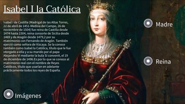 Isabel I de Castilla (Madrigal de las Altas Torres, 22 de abril de 1451-Medina del Campo, 26 de noviembre de 1504) fue reina de Castilla desde 1474 hasta 1504, reina consorte de Sicilia desde 1469 y de Aragón desde 1479,2 por su matrimonio con Fernando de Aragón. También ejerció como señora de Vizcaya. Se la conoce también como Isabel la Católica, título que le fue otorgado a ella y a su marido por el papa Alejandro VI mediante la bula Si convenit, el 19 de diciembre de 1496.Es por lo que se conoce al matrimonio real con el nombre de Reyes Católicos, título que usarían en adelante prácticamente todos los reyes de España.