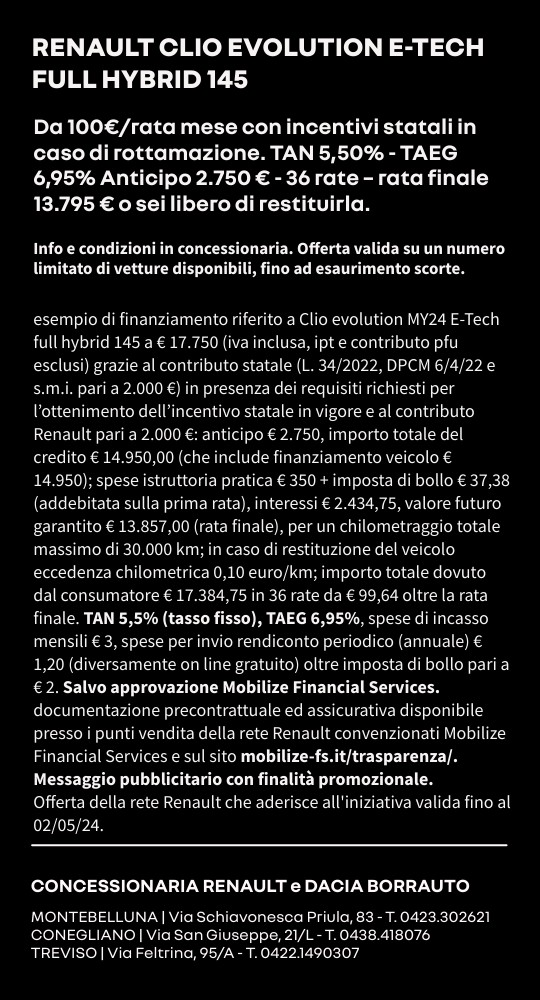 esempio di finanziamento riferito a Clio evolution MY24 E-Tech full hybrid 145 a € 17.750 (iva inclusa, ipt e contributo pfu esclusi) grazie al contributo statale (L. 34/2022, DPCM 6/4/22 e s.m.i. pari a 2.000 €) in presenza dei requisiti richiesti per l’ottenimento dell’incentivo statale in vigore e al contributo Renault pari a 2.000 €: anticipo € 2.750, importo totale del credito € 14.950,00 (che include finanziamento veicolo € 14.950); spese istruttoria pratica € 350 + imposta di bollo € 37,38 (addebitata sulla prima rata), interessi € 2.434,75, valore futuro garantito € 13.857,00 (rata finale), per un chilometraggio totale massimo di 30.000 km; in caso di restituzione del veicolo eccedenza chilometrica 0,10 euro/km; importo totale dovuto dal consumatore € 17.384,75 in 36 rate da € 99,64 oltre la rata finale. TAN 5,5% (tasso fisso), TAEG 6,95%, spese di incasso mensili € 3, spese per invio rendiconto periodico (annuale) € 1,20 (diversamente on line gratuito) oltre imposta di bollo pari a € 2. Salvo approvazione Mobilize Financial Services. documentazione precontrattuale ed assicurativa disponibile presso i punti vendita della rete Renault convenzionati Mobilize Financial Services e sul sito mobilize-fs.it/trasparenza/. Messaggio pubblicitario con finalità promozionale. Offerta della rete Renault che aderisce all'iniziativa valida fino al 02/05/24.