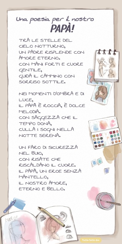 Tra le stelle del cielo notturno,un padre risplende con amore eterno. Con mani forti e cuore gentile, guida il cammino con sorriso sottile. Nei momenti d'ombra e di luce, il papà è roccia, è dolce melodia. Con saggezza che il tempo dona, culla i sogni nella notte serena. Un faro di sicurezza nel buio, con risate che riscaldano il cuore. Il papà, un eroe senza mantello, il nostro amore, eterno e bello.