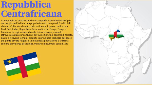 La Repubblica Centrafricana ha una superficie di 622mila km2 (più del doppio dell’Italia) e una popolazione di poco più di 5 milioni di abitanti. Collocato al centro del continente, il paese confina con Ciad, Sud Sudan, Repubblica Democratica del Congo, Congo e Camerun. La regione meridionale è ricca d’acqua, essendo attraversata da alcuni affluenti del fiume Congo, e coperta di foreste, da cui si ricavano legnami pregiati, la principale ricchezza del paese. Dal punto di vista religioso, la metà della popolazione è cristiana, con una prevalenza di cattolici, mentre i musulmani sono il 15%.