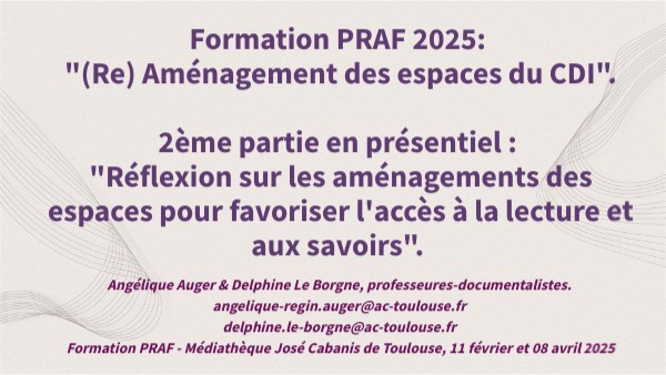 Formation PRAF 2025: "(Re) Aménagement des espaces du CDI". 2ème partie en présentiel : "Réflexion sur les aménagements des espaces pour favoriser l'accès à la lecture et aux savoirs".