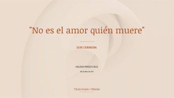 Nos encontramos ante un poema de Luis Cernuda titulado "No es el amor quien muere", escrito durante su estapa de desamor. El poema está compuesto por 6 estrofas con diferentes números de versos en cada una. El titulo de dicho poema se repite en el primer y último verso, sando así a entender su estructura circular. Organización de ideas: 1- La etapa del enamoramiento (1-11) 1.1- Explosión de sentimientos 1.2- Lo que le produce ganas de vivir 2-La etapa del desamor (12-22) 2.1-La pérdida del amor querido 2.1.1- El vacío que se genera 2.2-El sentimiento de la desolación Tésis: La sensación de estar muerto y vacío al perder ese amor.