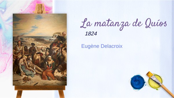 Esta pintura retrata un evento histórico: la masacre de la población de la isla griega de Quíos por las fuerzas otomanas en 1822. Delacroix presenta la brutalidad de la guerra y la opresión en un estilo expresivo y emocional. La pintura también tiene un trasfondo político y social, ya que Delacroix era partidario de las luchas por la libertad y la independencia.