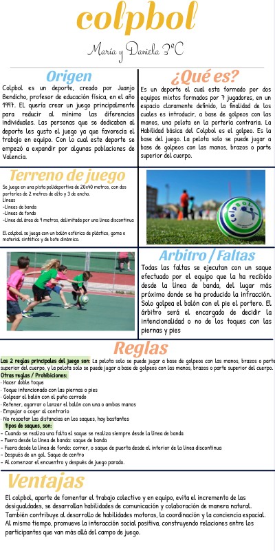 Colpbol es un deporte, creado por Juanjo Bendicho, profesor de educación física, en el año 1997. EL quería crear un juego principalmente para reducir al mínimo las diferencias individuales. Las personas que se dedicaban al deporte les gusto el juego ya que favorecía el trabajo en equipo. Con lo cual este deporte se empezó a expandir por algunas poblaciones de Valencia.