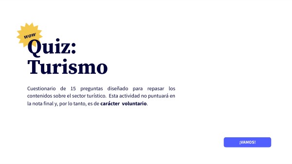 Cuestionario de 15 preguntas diseñado para repasar los contenidos sobre el sector turístico. Esta actividad no puntuará en la nota final y, por lo tanto, es de carácter voluntario.