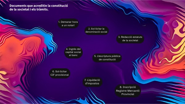 On es fa: Notaria. Documents necessaris: DNI o NIE dels socis, certificació de denominació social, estatuts de la societat, justificant de l'ingrés del capital social. En què consisteix: El notari autoritza l'escriptura de constitució de la societat, que inclou la denominació, objecte social, domicili, capital social, identitat dels socis, administradors, etc.