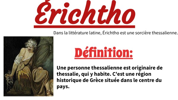 ● Description: Erichto est une sorcière Thessalienne ( tradition de l'antiquité ), elle est nécromancienne (culte de pouvoir parler avec les morts , qui pratique la manipulation des morts). Elle est décrite dans un passage du texte de Lucain (Pharsale, VI, v. 515-526) (Lucain l'a mise en scène au livre VI de son épopée la Pharsale (env. 60 ap. J.-C.) dans une scène difficilement soutenable de nécromancie.)