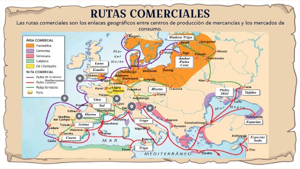 Lugares clave en la ruta comercial marítima: Mediterráneo: Conocido como el Mare Nostrum en la antigüedad, el Mediterráneo continuó siendo una vía crucial para el comercio. Ciudades como Venecia, Génova y Constantinopla eran centros comerciales importantes. Puertos del norte de Europa: Ciudades como Brujas, Hamburgo y Lübeck en el norte de Europa eran fundamentales para el comercio del Báltico y del Mar del Norte. Rutas hacia el Atlántico: A medida que avanzaba la Edad Media, las rutas comerciales atlánticas se volvieron más relevantes, conectando Europa con las Américas y África. Las ciudades como Lisboa y Sevilla eran cruciales en este contexto