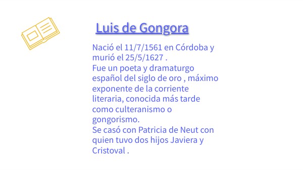 Nació el 11/7/1561 en Córdoba y murió el 25/5/1627 . Fue un poeta y dramaturgo español del siglo de oro , máximo exponente de la corriente literaria, conocida más tarde como culteranismo o gongorismo. Se casó con Patricia de Neut con quien tuvo dos hijos Javiera y Cristoval .