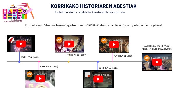 Entzun beheko "denbora lerroan" agertzen diren KORRIKAKO abesti ezberdinak. Ea zein gustatzen zaizun gehien!