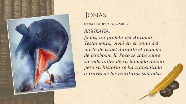 BIOGRAFÍA: Jonás, un profeta del Antiguo Testamento, vivió en el reino del norte de Israel durante el reinado de Jeroboam II. Poco se sabe sobre su vida antes de su llamado divino, pero su historia se ha transmitido a través de las escrituras sagradas.