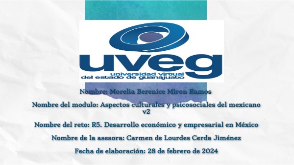 Nombre: Morelia Berenice Miron Ramos Nombre del modulo: Aspectos culturales y psicosociales del mexicano v2 Nombre del reto: R5. Desarrollo económico y empresarial en México Nombre de la asesora: Carmen de Lourdes Cerda Jiménez Fecha de elaboración: 28 de febrero de 2024