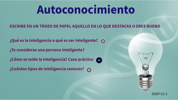 ESCRIBE EN UN TROZO DE PAPEL AQUELLO EN LO QUE DESTACAS O ERES BUENO ¿Qué es la inteligencia o qué es ser inteligente? ¿Te consideras una persona inteligente? ¿Cómo se mide la inteligencia? Caso práctico ¿Cuántos tipos de inteligencia conoces?