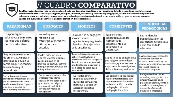 En el lenguaje educativo más comúnmente utilizado por docentes, investigadores y escritores de todo el mundo no se establece una diferenciación estricta entre paradigmas, enfoques, modelos, corrientes y tendencias pedagógicas, usados indistintamente para hacer referencia a teorías, métodos, concepciones y escuelas de pensamiento relacionados con la educación en general y estrechamente ligados a la evolución de la Psicología como ciencia en diferentes ramas.