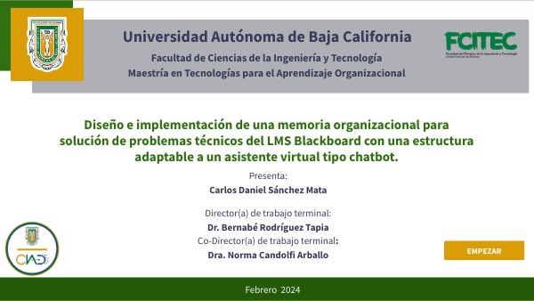 Con la realización de este proyecto se pudo identificar la necesidad que existía en el centro la cual era le de adoptar nuevas tecnologías que incluyen la gestión del conocimiento y aprendizaje organizacional, las cuales permitan almacenar y acceder a la información gestionada de una manera simple y funcional. Se contemplo la creación de un proceso para gestionar la información del centro con ayuda de tecnologías digitales, es decir la creación de una memoria organizacional y un agente virtual para poder almacenar y acceder a la información relevante que genera el CIAD. Como parte de las conclusiones, el proyecto se inicio delimitado a un grupo en específico de usuarios, pero al estar en el desarrollo se puedo llegar a la conclusión que la información presentada puede ser de importancia no solo para un grupo en específico si no par toda la comunidad UABC, por este motivo se pretende seguir trabajando con el llenado de información para a si cubrir las diferentes necesidades de los usuarios. Para finalizar, con la implementación de esta herramienta tecnológica se pretende alcanzar el objetivo que es la retención del conocimiento y subir el porcentaje con el que se contaba al momento de hacer el diagnóstico organizacional que era de un 77%, al contar con la MO se tendrá un mayor porcentaje de retención generando una mejora y seguir avanzado como una organización que aprende