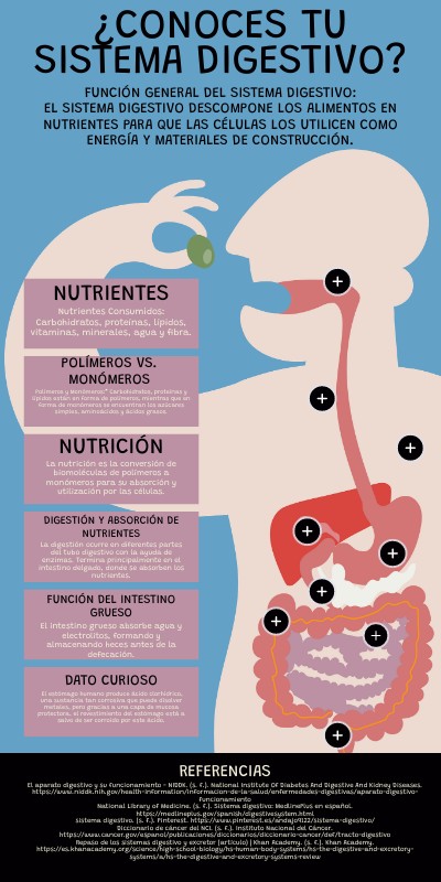 El aparato digestivo y su funcionamiento - NIDDK. (s. f.). National Institute Of Diabetes And Digestive And Kidney Diseases. https://www.niddk.nih.gov/health-information/informacion-de-la-salud/enfermedades-digestivas/aparato-digestivo-funcionamiento National Library of Medicine. (s. f.). Sistema digestivo: MedlinePlus en español. https://medlineplus.gov/spanish/digestivesystem.html sistema digestivo. (s. f.). Pinterest. https://www.pinterest.es/andajo9122/sistema-digestivo/ Diccionario de cáncer del NCI. (s. f.). Instituto Nacional del Cáncer. https://www.cancer.gov/espanol/publicaciones/diccionarios/diccionario-cancer/def/tracto-digestivo Repaso de los sistemas digestivo y excretor (artículo) | Khan Academy. (s. f.). Khan Academy. https://es.khanacademy.org/science/high-school-biology/hs-human-body-systems/hs-the-digestive-and-excretory-systems/a/hs-the-digestive-and-excretory-systems-review
