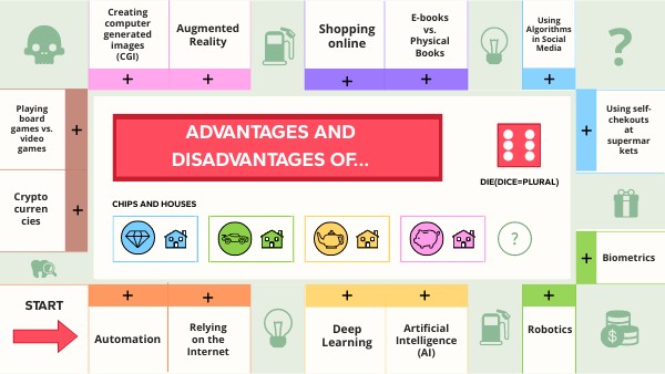 Each player must choose a colour: blue, green, yellow or pink. Thus you obtain a token to mark your position and 10 houses to indicate the properties that you acquire throughout the game. Each player must take the token of their color and place it in the starting box. To start playing, click on the die and move your token to the corresponding box. In each box there must be one or more questions. If you get it right, place one of your houses in that box. Congratulations, you have obtained a new property! Special spaces: spaces with icons can contain penalties such as "The player pays electricity taxes: loses 2 houses." Get the question right to avoid the penalty! The player who has the greatest number of houses on the board will win once all the squares are occupied.