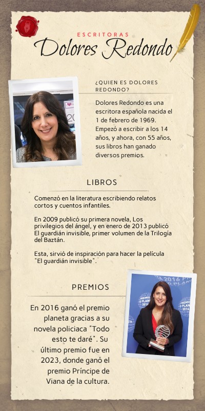 Dolores Redondo es una escritora española nacida el 1 de febrero de 1969. Empezó a escribir a los 14 años, y ahora, con 55 años, sus libros han ganado diversos premios.