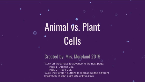 *Click on the arrows to advance to the next page. Page 1 = Animal Cell Page 2 = Plant Cell *Click the Purple + buttons to read about the different organelles in both plant and animal cells.