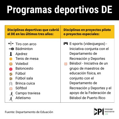 E-sports (videojuegos) - Iniciativa conjunta con el Departamento de Recreación y DeportesBéisbol - Iniciativa de un grupo de maestros de educación física, en conjunto con el Departamento de Recreación y Deportes y el apoyo de la Federación de Béisbol de Puerto Rico