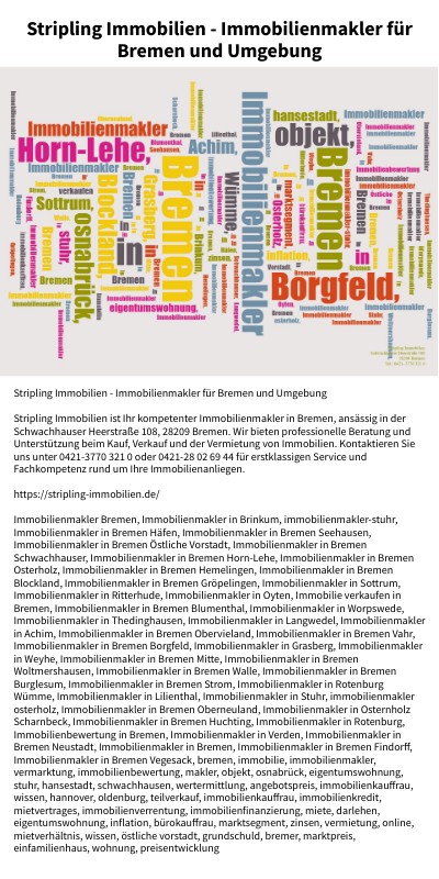 Stripling Immobilien - Immobilienmakler für Bremen und Umgebung Stripling Immobilien ist Ihr kompetenter Immobilienmakler in Bremen, ansässig in der Schwachhauser Heerstraße 108, 28209 Bremen. Wir bieten professionelle Beratung und Unterstützung beim Kauf, Verkauf und der Vermietung von Immobilien. Kontaktieren Sie uns unter 0421-3770 321 0 oder 0421-28 02 69 44 für erstklassigen Service und Fachkompetenz rund um Ihre Immobilienanliegen. https://stripling-immobilien.de/ Immobilienmakler Bremen, Immobilienmakler in Brinkum, immobilienmakler-stuhr, Immobilienmakler in Bremen Häfen, Immobilienmakler in Bremen Seehausen, Immobilienmakler in Bremen Östliche Vorstadt, Immobilienmakler in Bremen Schwachhauser, Immobilienmakler in Bremen Horn-Lehe, Immobilienmakler in Bremen Osterholz, Immobilienmakler in Bremen Hemelingen, Immobilienmakler in Bremen Blockland, Immobilienmakler in Bremen Gröpelingen, Immobilienmakler in Sottrum, Immobilienmakler in Ritterhude, Immobilienmakler in Oyten, Immobilie verkaufen in Bremen, Immobilienmakler in Bremen Blumenthal, Immobilienmakler in Worpswede, Immobilienmakler in Thedinghausen, Immobilienmakler in Langwedel, Immobilienmakler in Achim, Immobilienmakler in Bremen Obervieland, Immobilienmakler in Bremen Vahr, Immobilienmakler in Bremen Borgfeld, Immobilienmakler in Grasberg, Immobilienmakler in Weyhe, Immobilienmakler in Bremen Mitte, Immobilienmakler in Bremen Woltmershausen, Immobilienmakler in Bremen Walle, Immobilienmakler in Bremen Burglesum, Immobilienmakler in Bremen Strom, Immobilienmakler in Rotenburg Wümme, Immobilienmakler in Lilienthal, Immobilienmakler in Stuhr, immobilienmakler osterholz, Immobilienmakler in Bremen Oberneuland, Immobilienmakler in Osternholz Scharnbeck, Immobilienmakler in Bremen Huchting, Immobilienmakler in Rotenburg, Immobilienbewertung in Bremen, Immobilienmakler in Verden, Immobilienmakler in Bremen Neustadt, Immobilienmakler in Bremen, Immobilienmakler in Bremen Findorff, Immobilienmakler in Bremen Vegesack, bremen, immobilie, immobilienmakler, vermarktung, immobilienbewertung, makler, objekt, osnabrück, eigentumswohnung, stuhr, hansestadt, schwachhausen, wertermittlung, angebotspreis, immobilienkauffrau, wissen, hannover, oldenburg, teilverkauf, immobilienkauffrau, immobilienkredit, mietvertrages, immobilienverrentung, immobilienfinanzierung, miete, darlehen, eigentumswohnung, inflation, bürokauffrau, marktsegment, zinsen, vermietung, online, mietverhältnis, wissen, östliche vorstadt, grundschuld, bremer, marktpreis, einfamilienhaus, wohnung, preisentwicklung