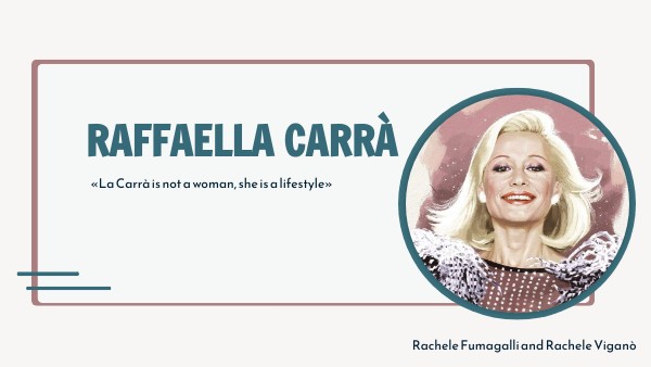 NAME: Raffaella CarràFULL NAME: Raffaella Maria Roberta Pelloni DATES OF BIRTH AND DEATH: 1943/06/18 Bologna – 2021/07/05 Roma WHO IS SHE: one of the most popular Italian singer and presenter. PARENTS: Raffaele Pelloni e Angela Iris Dell’Utri HER PARTNERS: Gianni Boncompagni, Sergio Japino ZODIAC SIGN: twins