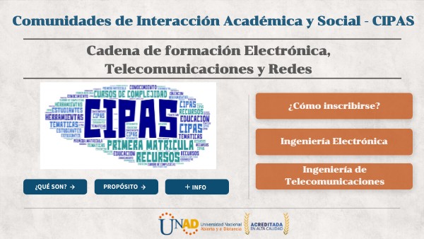 Las CIPAS (Comunidades de Interacción Académica y Social) de Primera Matrícula y Cursos de Complejidad dinamizados por las Escuelas y Zonas - CIPAS PM/CC se constituyen como una estrategia de acompañamiento docente que dinamiza la vida académica del estudiante a través de planificaciones pedagógicas y didácticas sincrónicas contextualizadas al momento del aprendizaje del estudiante, las cuales buscan afianzar competencias y resultados de aprendizaje de los programas académicos, así como la impronta Unadista.